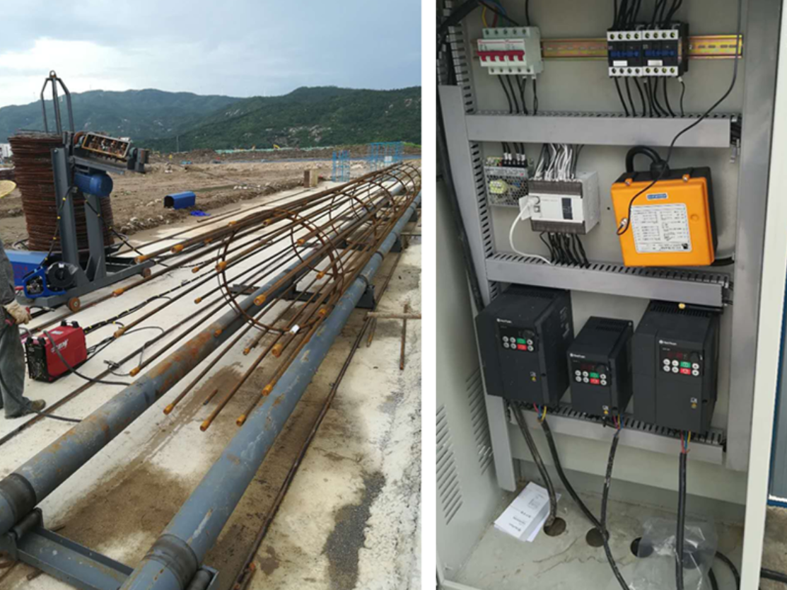 终止焊接:在钢筋笼的尾部,移动盘和固定盘继续旋转,暂停焊接,将盘筋并排绕几圈,然后将盘筋端头焊接在主筋上固定,完成焊接。