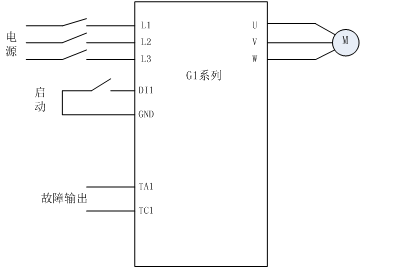 采用G1系列矢量型通用变频器驱动挤出机组螺杆主机,V/F控制,键盘外拉10米左右,键盘电位器调速,外部端子启停,故障信号输出。