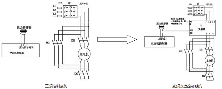 (1)压力传感器信号:原有系统中压力传感器信号只接入空压机控制器,改造后,需要压力传感器信号作为PID控制的反馈信号,所以需要将压力传感器信号(4~20mA)串联接入控制器和变频器模拟电流输入端AI1;