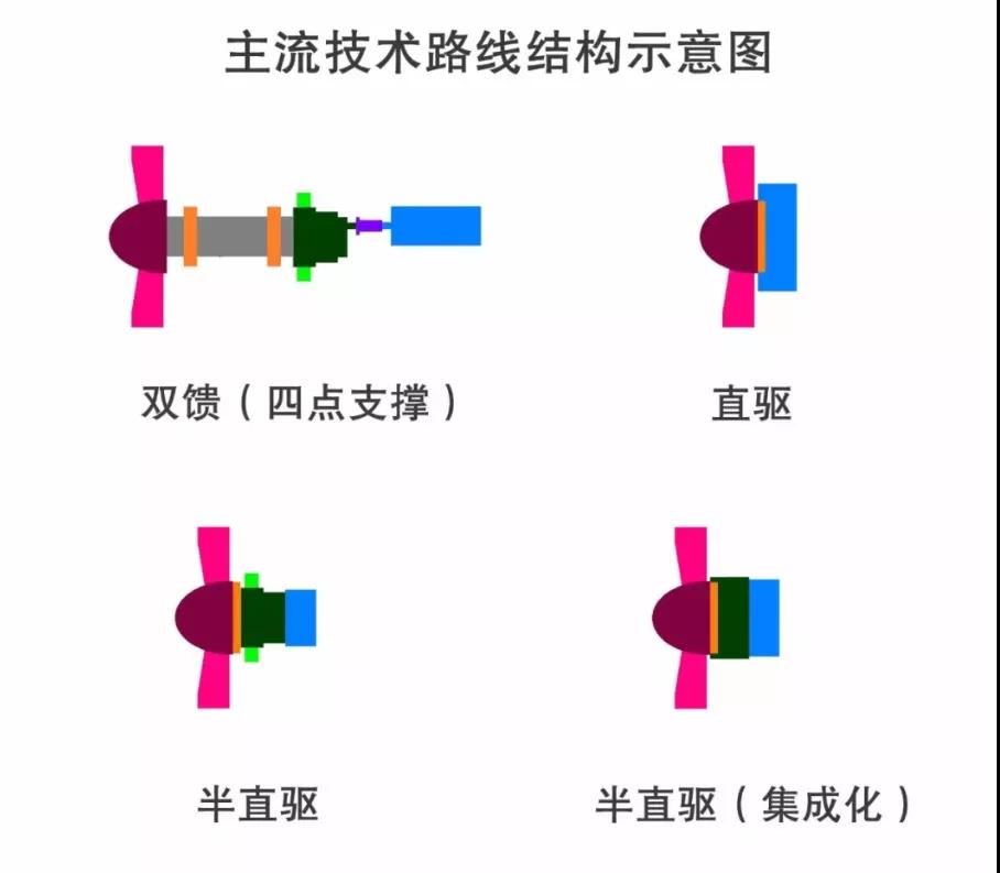 即便是中速传动技术路线阵营本身,根据主轴系、齿轮箱与发电机的集成度与组合关系,也可分为多种形式技术方案。