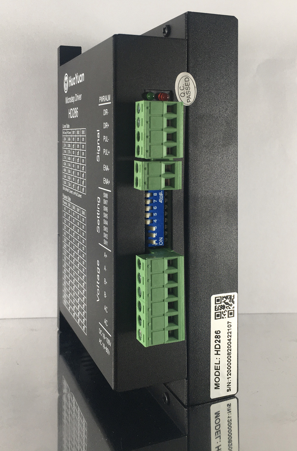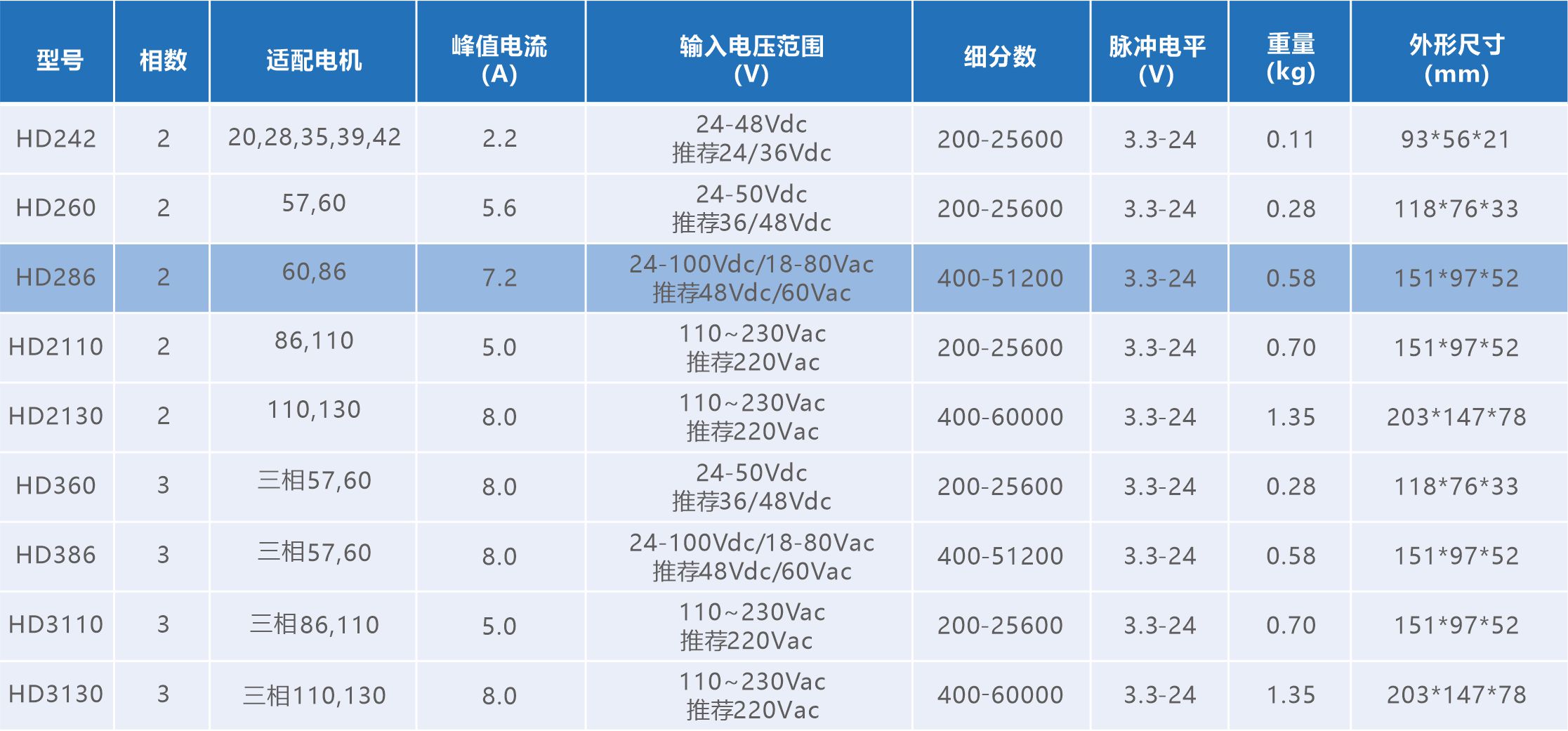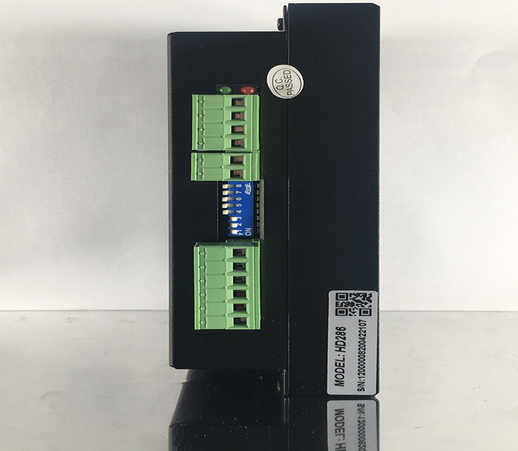 HD286 开环步进驱动器HD286 步进驱动器,基于 32 位 DSP 处理芯片的平台,采用内部 PID 电流控制算法设计,具有优异的性能表现。内置微细分技术使得 HD286 步进驱动器具有低噪音、低振动、低发热和高速大力矩输出的特点,能够很好的适应于步进电机的大部分运用场合。 HD286 步进驱动器可通过拨码开关选择运行电流和细分,有 16 种细分、8 种电流选择, 具有过压,欠压,过电流流保护,其输入输出控制信号均采用光电隔离。