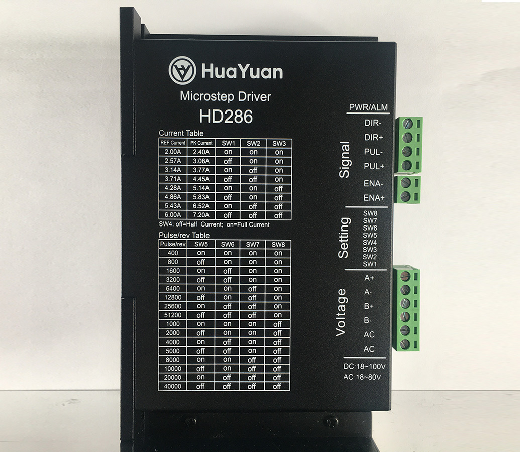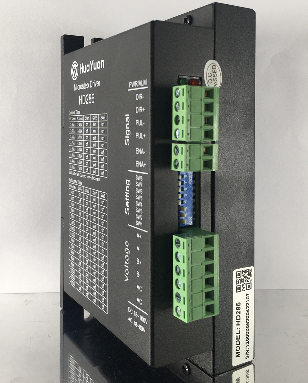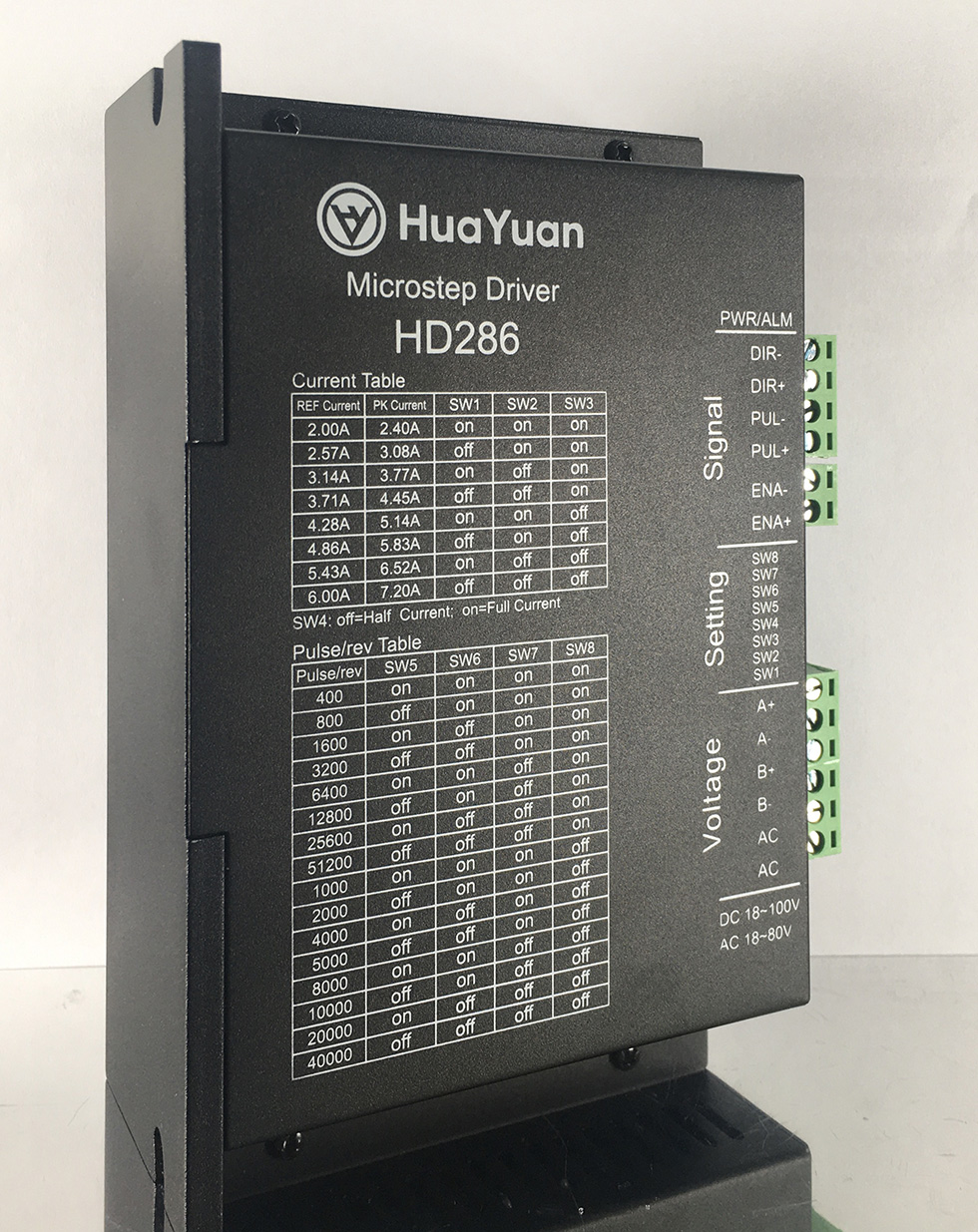 HD286 开环步进驱动器HD286 步进驱动器,基于 32 位 DSP 处理芯片的平台,采用内部 PID 电流控制算法设计,具有优异的性能表现。内置微细分技术使得 HD286 步进驱动器具有低噪音、低振动、低发热和高速大力矩输出的特点,能够很好的适应于步进电机的大部分运用场合。 HD286 步进驱动器可通过拨码开关选择运行电流和细分,有 16 种细分、8 种电流选择, 具有过压,欠压,过电流流保护,其输入输出控制信号均采用光电隔离。