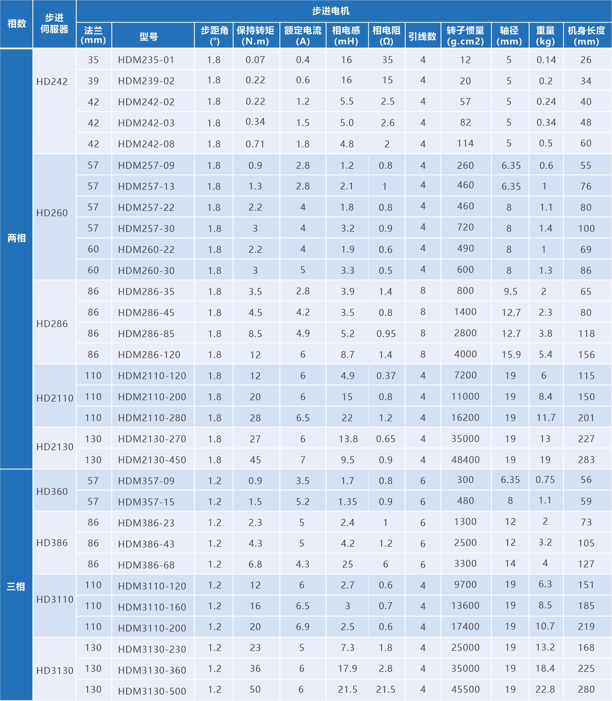 HDM286 开环步进电机HD系列步进,包括HD系列驱动器、HDM系列电机,是我司基于自动化行业的安全稳定可靠、精准高效智能、高性价比、体积紧凑等多方面市场需求,针对性推出的单相、三相步进系统,完美驱动从35mm到130mm机座的全系列的两相、三相高品质步进电机。 HD系列步进,具有更高可靠、更大力矩、更高精度、更低发热、更平稳性等特点,广泛应用于电子、五金、木工、雕刻、玻璃、激光、喷绘、包装、纺织服装等自动化设备和生产线。