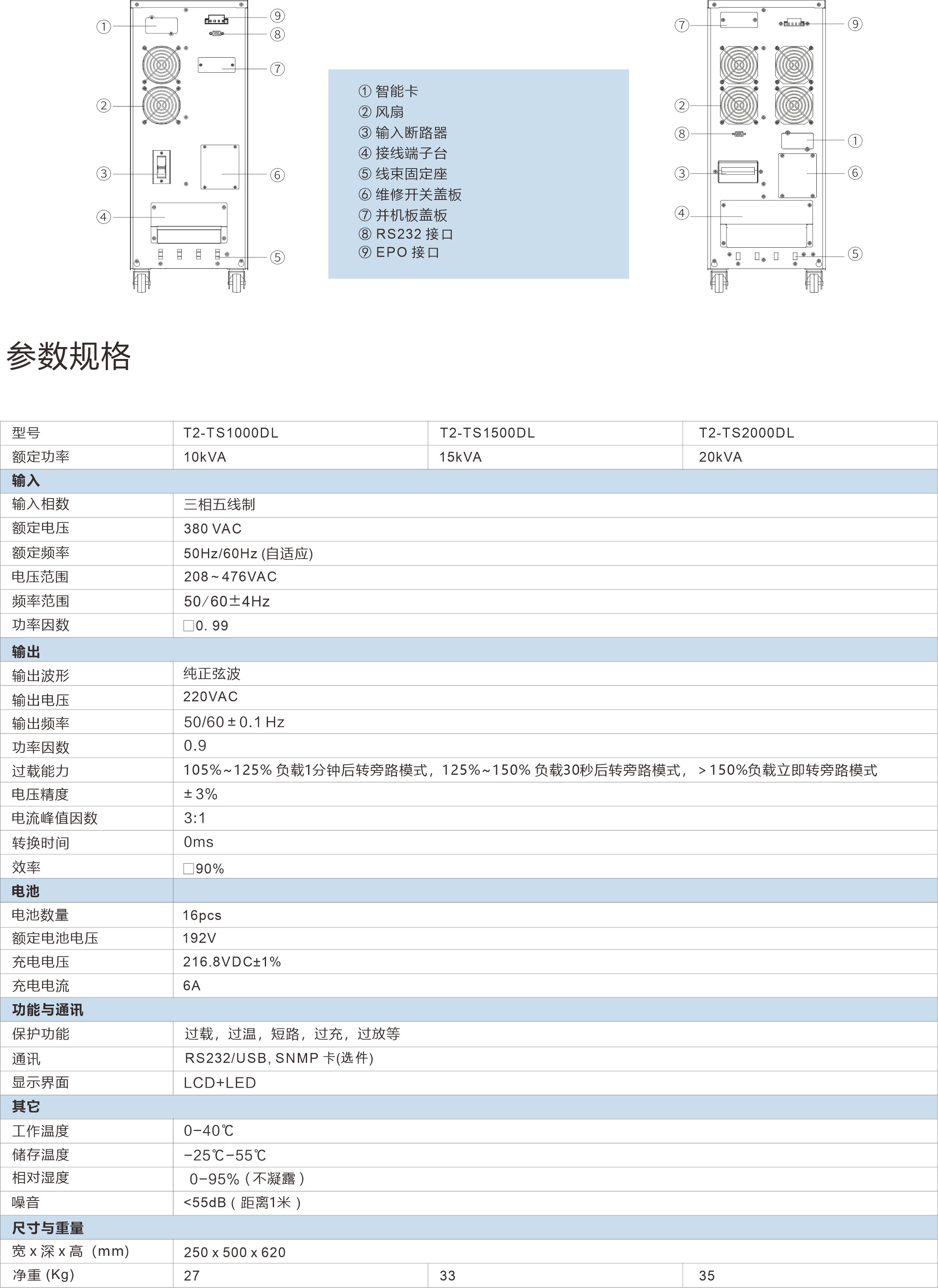 T2 系列在线式高频UPS 10kVA-20kVAT2 系列在线高频智能化 UPS,采用双变换设计、DSP 数字控制,集成输入功率因数校正技术,保证更加优良的输出性能,满足设备需求,LCD+LED 可视化界面方便快捷掌控UPS 和设备工作信息。