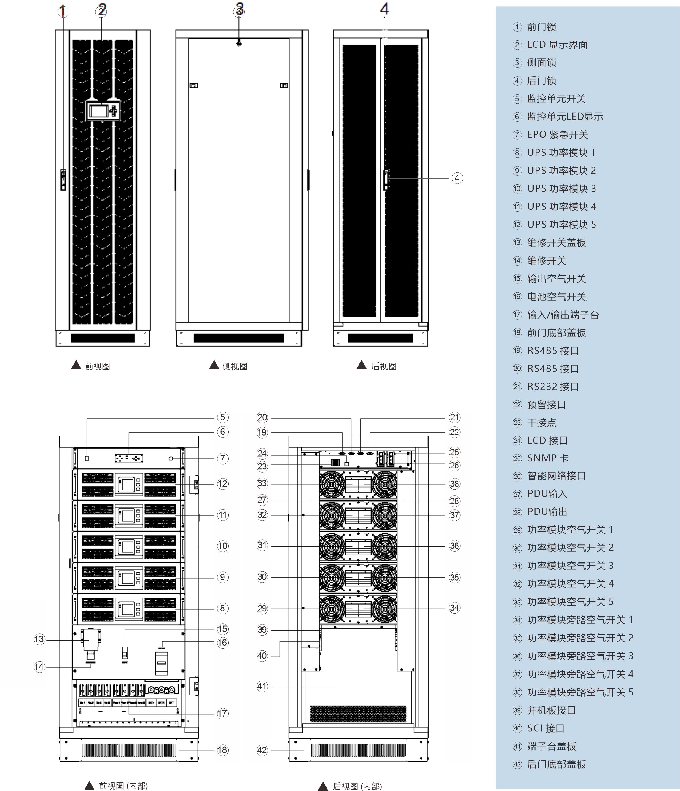 2. 高功率密度设计, 单模块容量30KVA,模块高度均为3U模块, 可以在线加入、在线拔出,实现“零”检修时间;