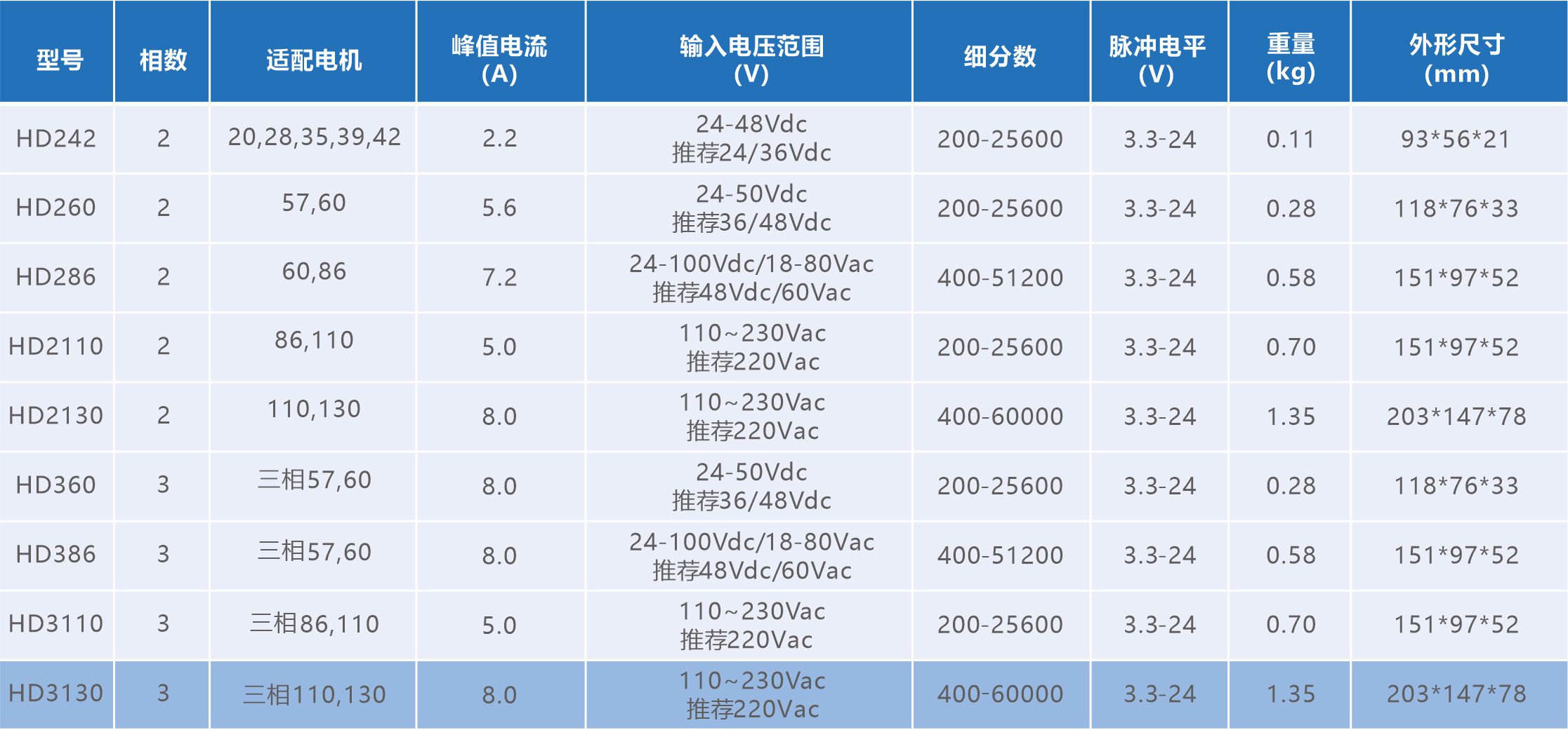 HD3130开环步进驱动器HD3130 步进驱动器,基于32 位 DSP 处理芯片的平台,采用内部 PID 电流控制算法设计, 具有优异的性能表现。内置微细分技术使得HD3130步进驱动器具有低噪音、低振动、低发热和高 速大力矩输出的特点,能够很好的适应于步进电机的大部分运用场合。 HD3130 内置脉冲指令 S 型加减速功能以及极限频率可选功能,由拨码设置。另外可通过拨码开关选择运行细分和电流,有 16 种细分、16 种电流选择;驱动器集成过压,欠压,过电流保护,其输入输出控制信号均采用光电隔离。