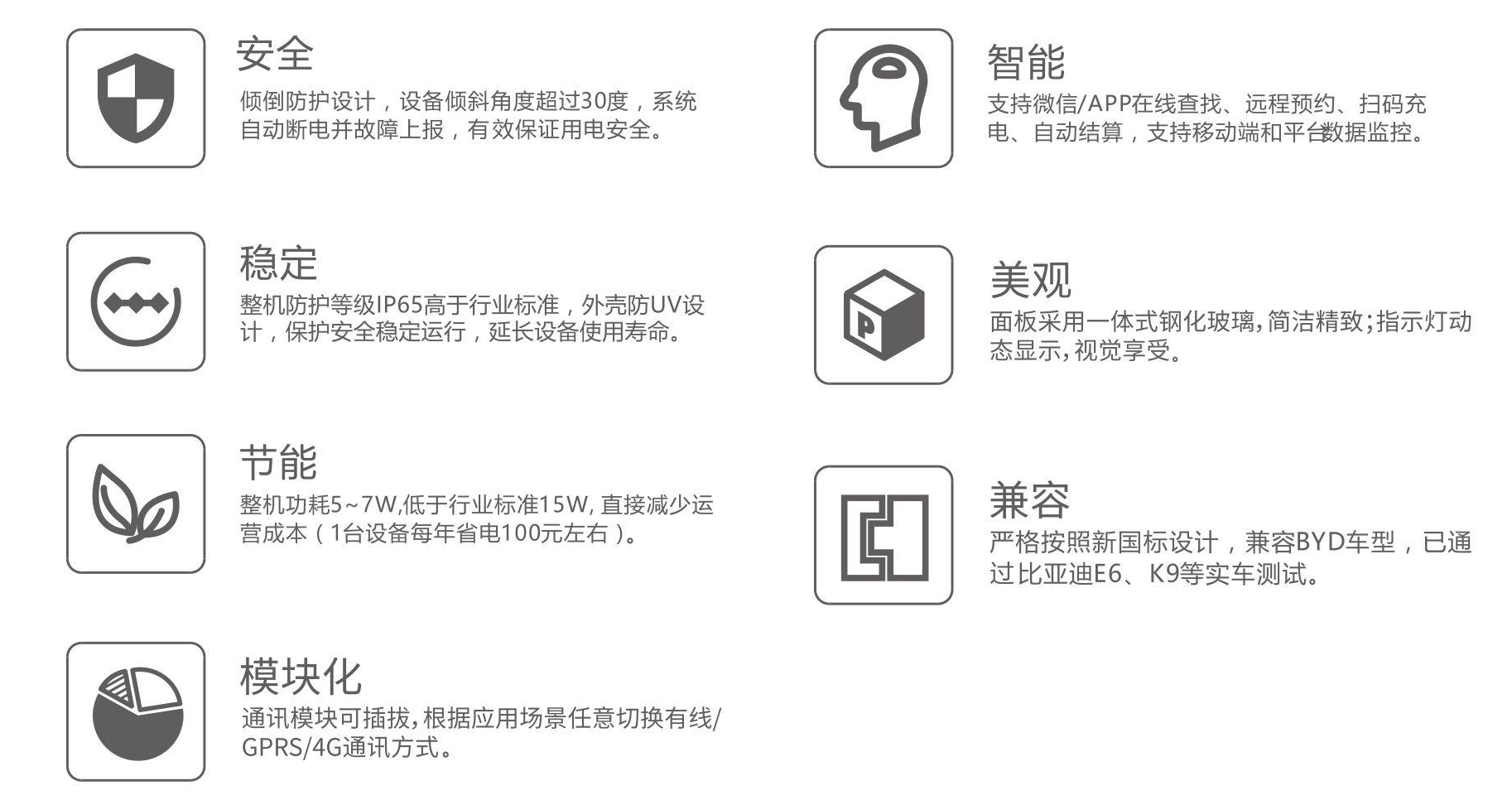 主要提供给BYD E5\E6\K9等具备三相车载电机的乘用车与客车使用。充电站集人机交互、充电控制、安全防护、计量计费、数据通讯功能与一体,安装方便、部署快捷、性能稳定。