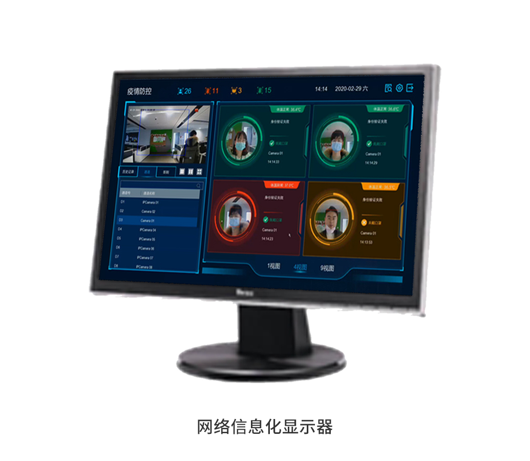热成像集群测温系统热成像集群测温系统,由测温半球机、校准黑体、全能小超脑、网络信息化显示器、Wed端人员管理系统构成,集视频监控、热成像测温功能于一体,测量距离0.8-4.5m,可同时人脸识别20人测温,无感通过。人性化疫情防控界面,实时高温异常/未佩戴口罩/体温正常人数统计,人脸多帧抓拍,显示最优人脸图,广泛应用于学校、公园、会场等疫情防控场所。