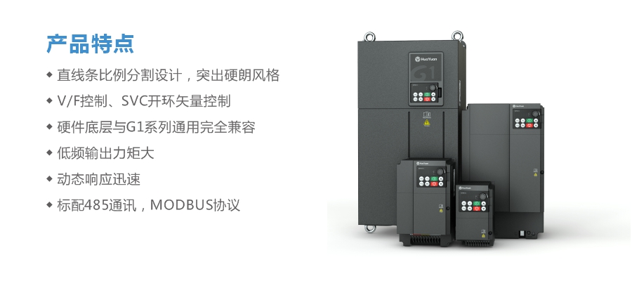 G1E系列永磁同步开环矢量变频器G1E系列变频器是一款永磁同步产品,主要用于驱动同步机,功率为0.75kW-800kW。G1E系列采用先进的矢量控制技术,内置电机参数辨识,低频输出力矩大、动态响应迅速、过载能力强,模块化的控制组件和丰富的扩展功能,可广泛应用于空压机、机床、纺织、塑料、化工等行业。