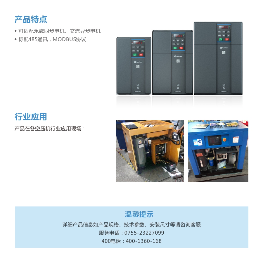 Z100-K系列永磁同步空压机专用变频器是一款永磁同步产品,主要用于驱动同步机,功率为5.5kW-37kW。Z100-K系列采用先进的矢量控制技术,内置电机参数辨识,低频输出力矩大、动态响应迅速、过载能力强,模块化的控制组件和丰富的扩展功能,可广泛应用于空压机、机床、纺织、塑料、化工等行业。