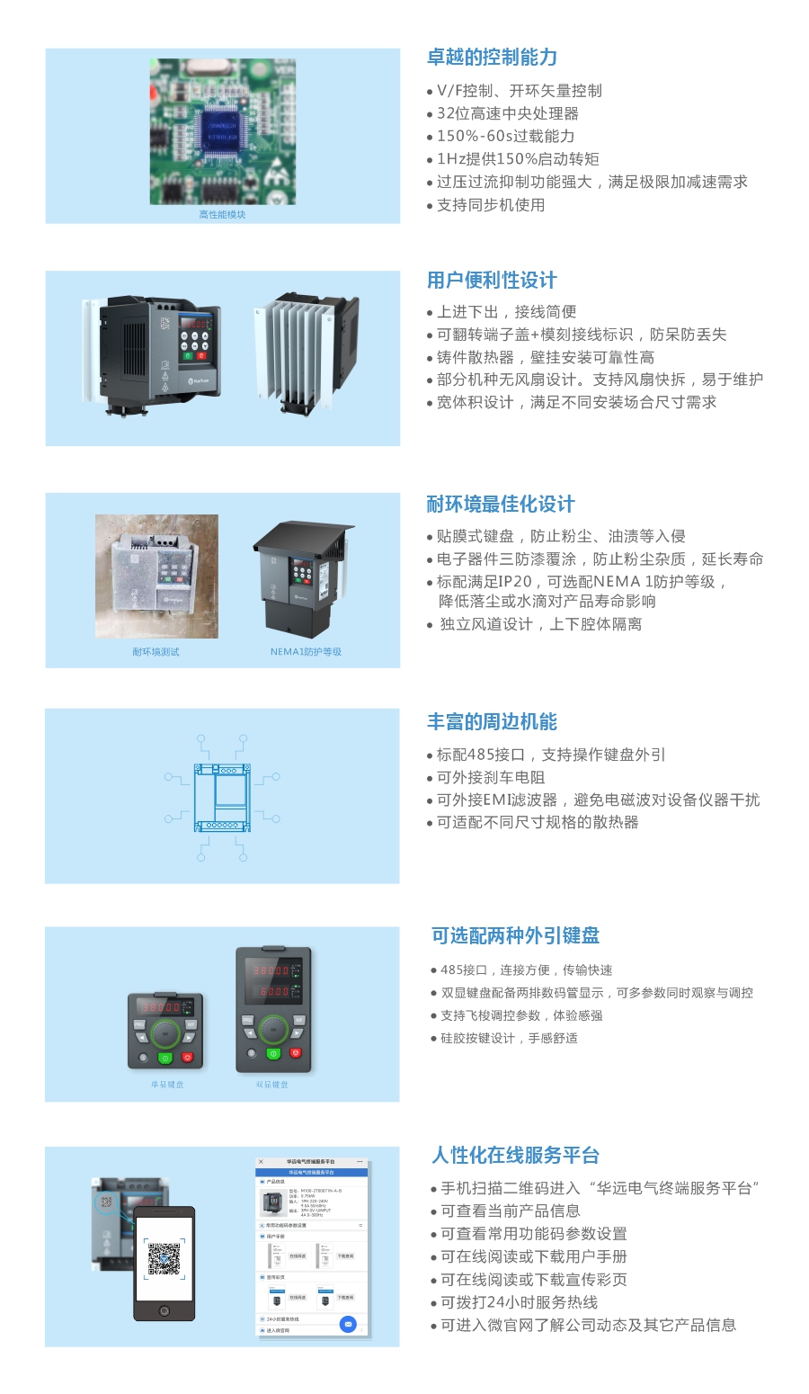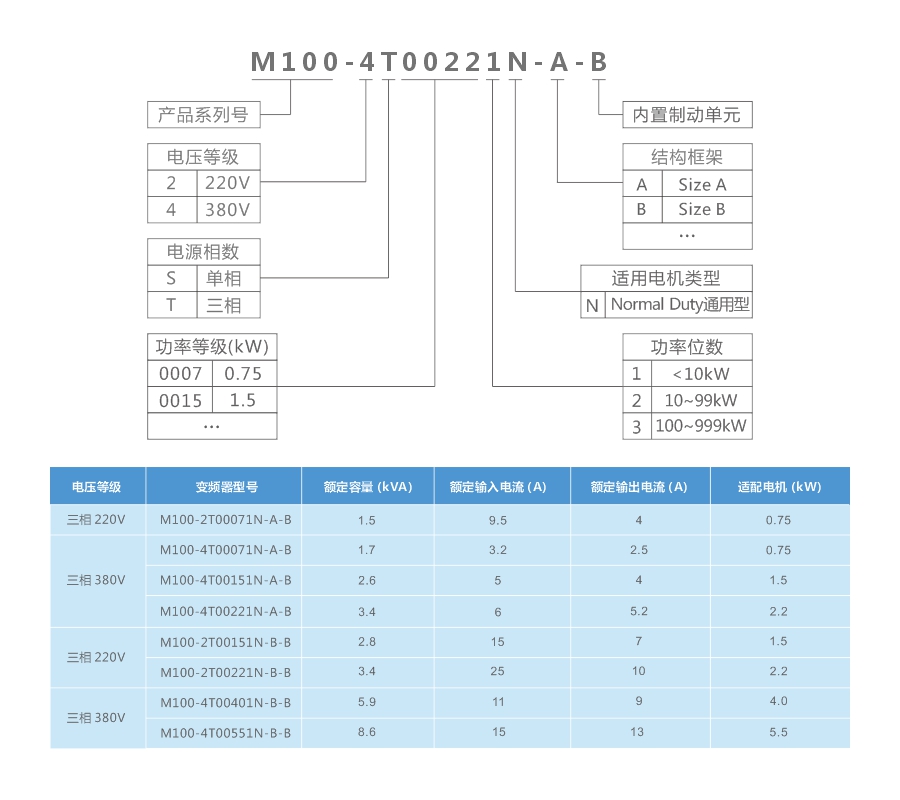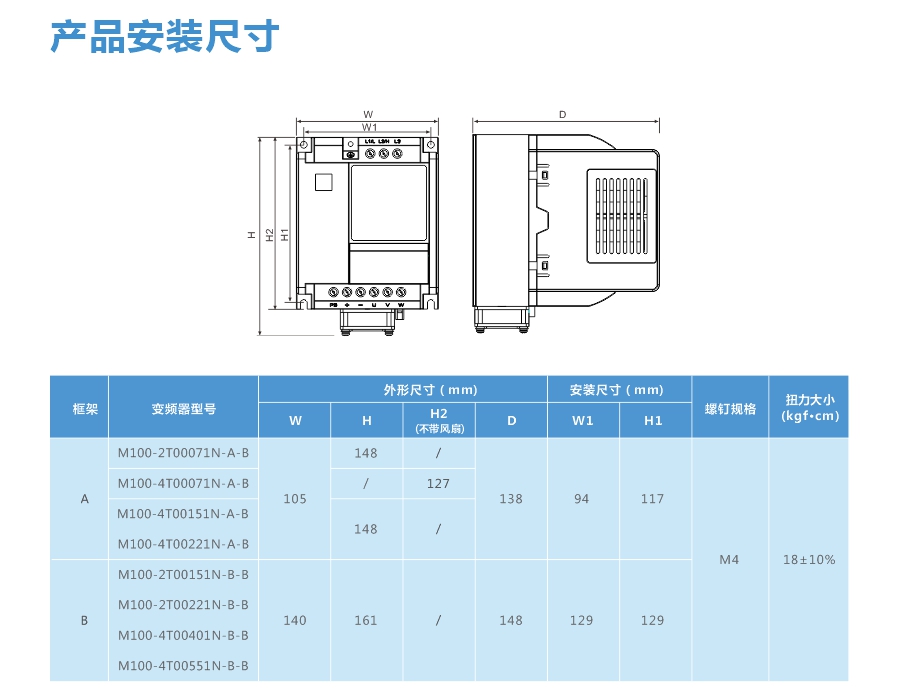 M100系列防护型开环矢量变频器M100系列防护型开环矢量变频器造型上延续M1系列家族的风格同,控制性能上支持V/F控制、开环矢量控制、M100E支持同步机使用。 M100系列可应用于食品包装、木工雕刻、自动化流水线、陶瓷、纺织、工业洗衣机、金属加工、风机水泵等行业,防护等级高、保护功能齐全、性能卓越、调试简单。